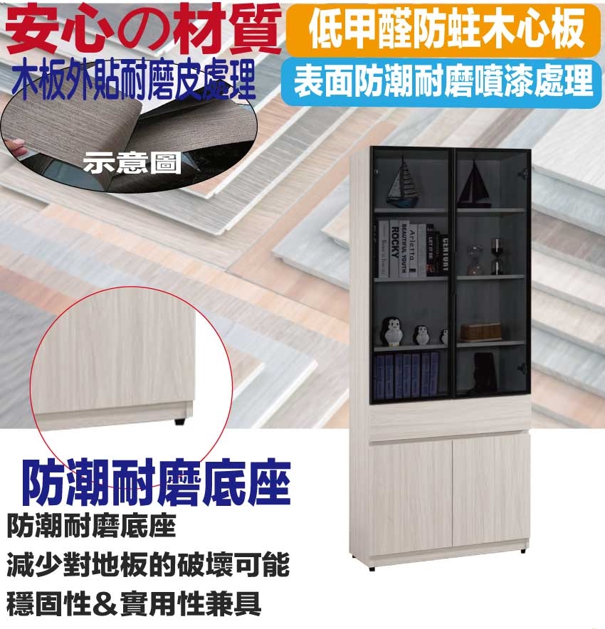 採用防蛀木心板+防潮耐磨底座+防夾手緩衝門片五金+鋁製黑漆邊框+5mm強化灰玻璃+五金滑軌結構等安心材質製造