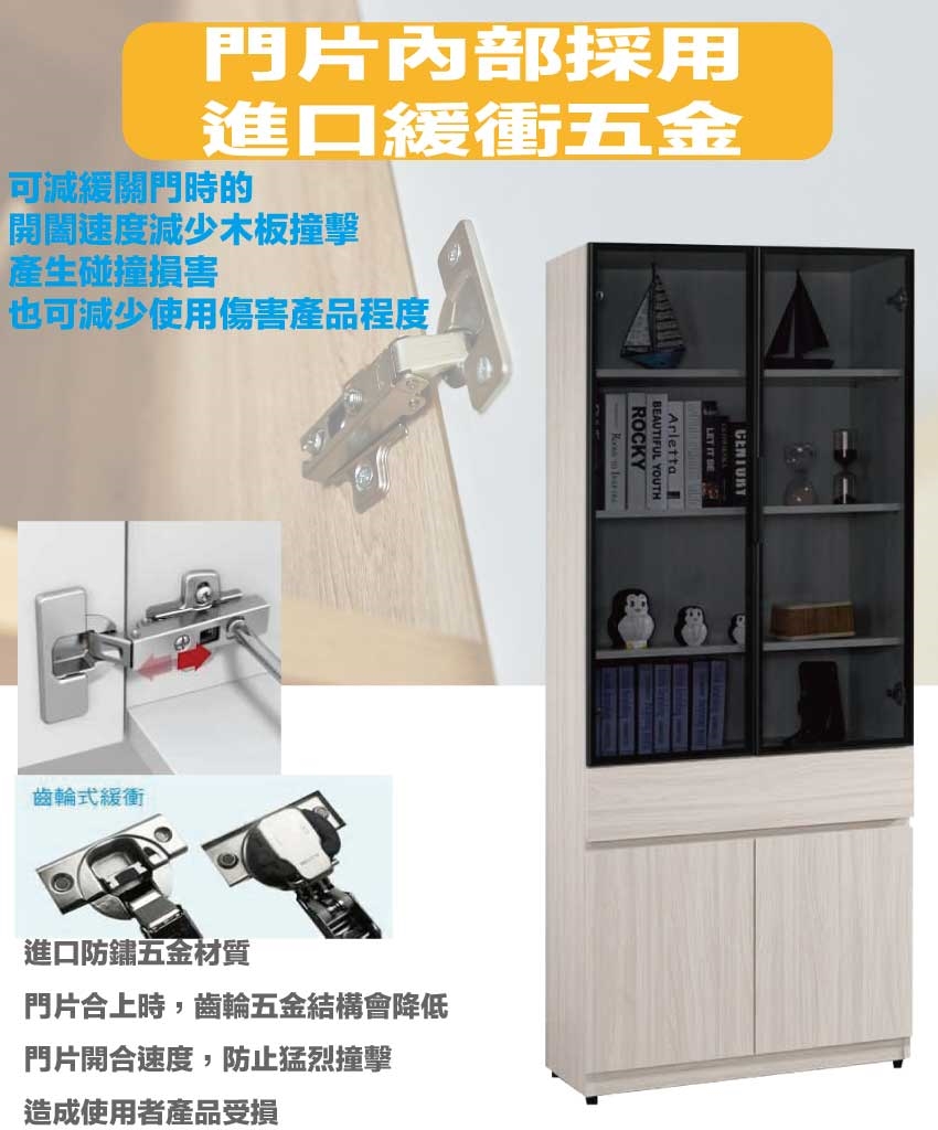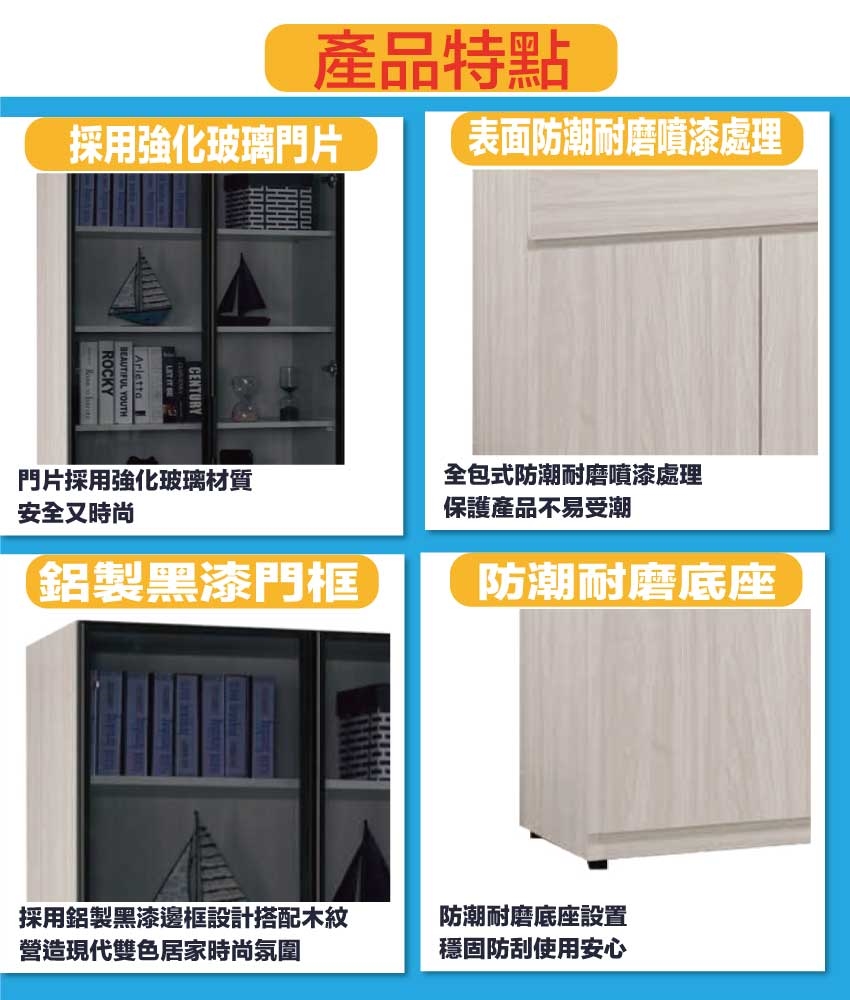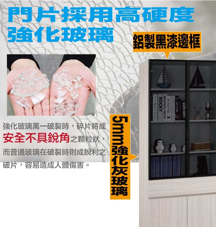 材質:防蛀木心板+防潮耐磨腳座+防夾手緩衝門片五金+鋁製黑漆邊框+5mm強化灰玻璃+五金滑軌結構