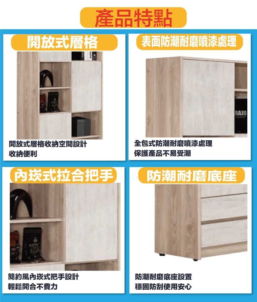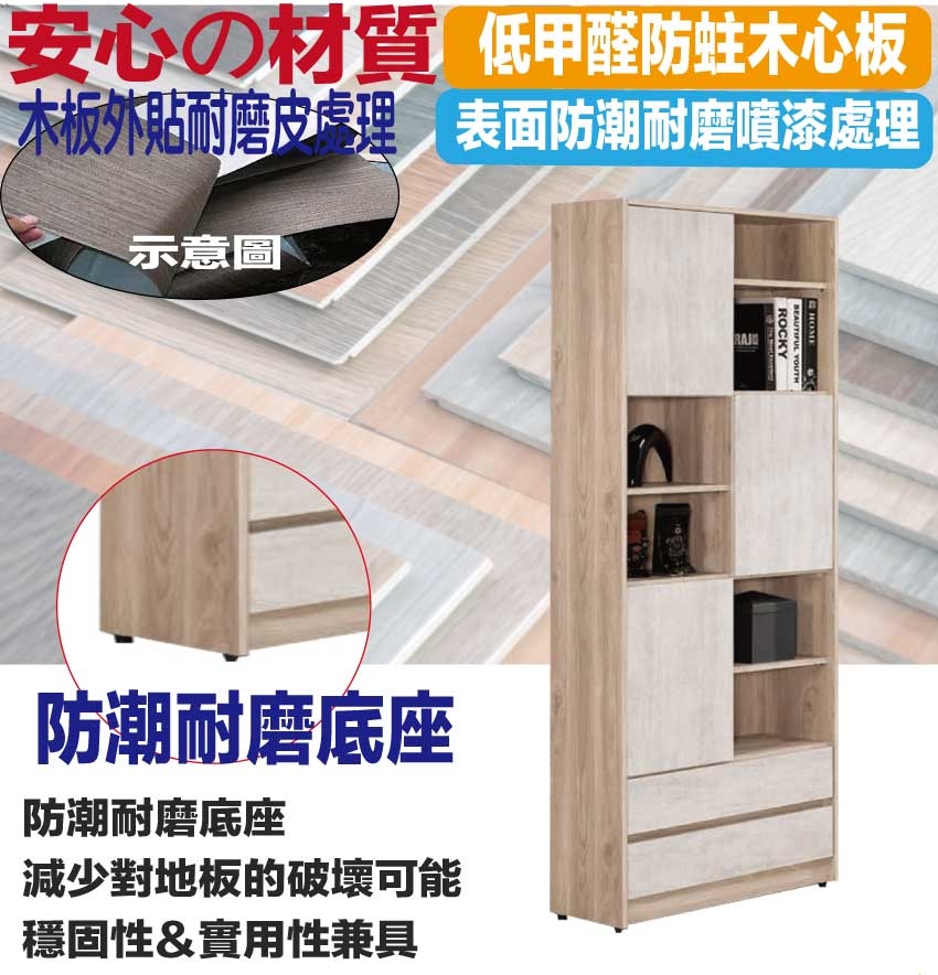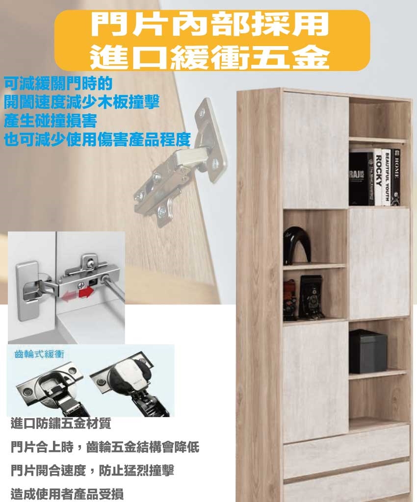 材質:防蛀木心板+防潮耐磨底座+防夾手緩衝門片五金+五金滑軌結構