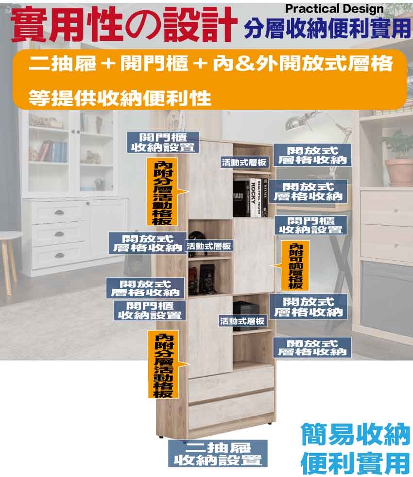 搭配採用開門櫃+二抽屜+開放層格等收納空間設計
