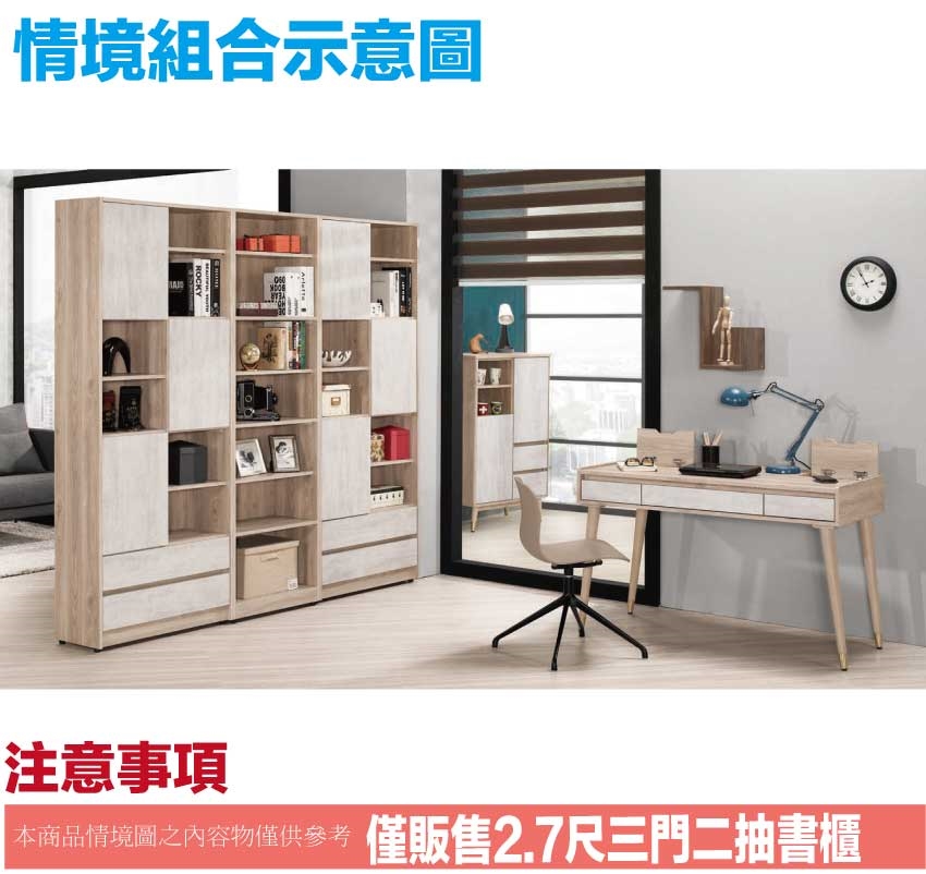 【綠家居】諾爾雙色2.7尺三門二抽書櫃