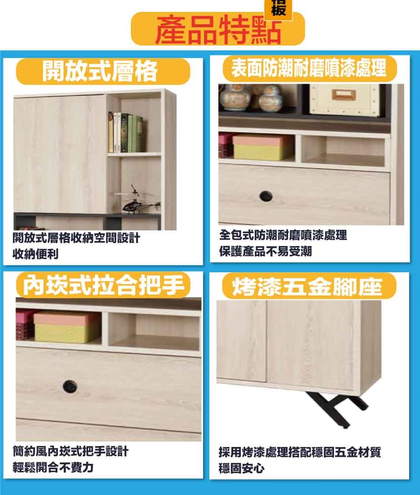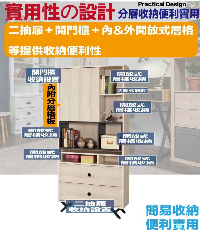 搭配採用開門櫃+二抽屜+內&外開放層格等收納空間設計