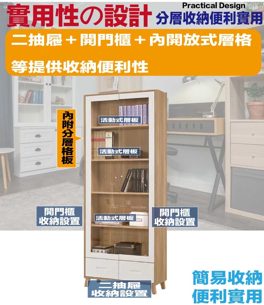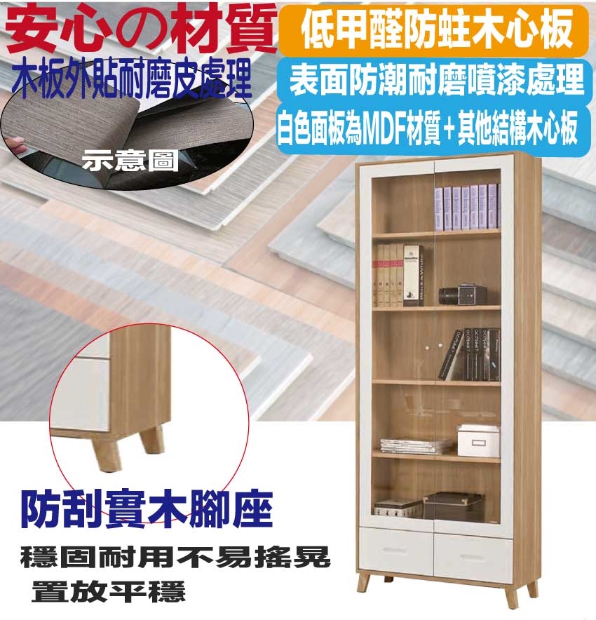 ★偏遠地區需額外加收運費,下標請先問與答詢問★ ★下訂前注意 由於商品流動較快,下訂前請先詢問是否有貨在下訂喔~★ 【綠家居】卡蜜雙色2.7尺二門二抽書櫃 木紋雙色系+安心材質製造,使用放心+搭配居家更便利,採用防蛀木心板+防潮MDF板(白色面板)+防刮實木腳座+5mm強化玻璃等安心材質製造 ,外層採用防潮耐磨噴漆處理搭配採用開門櫃+二抽屜+內開放層格等收納空間設計,全由專人配送到家,專業安心服務,替你省下更多時間!