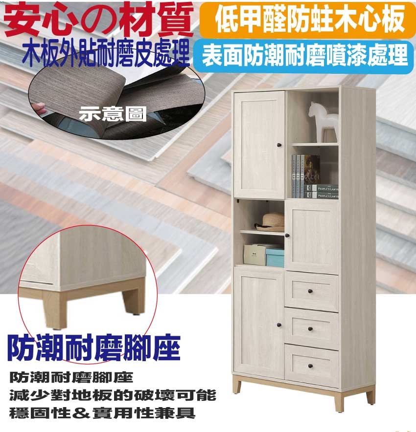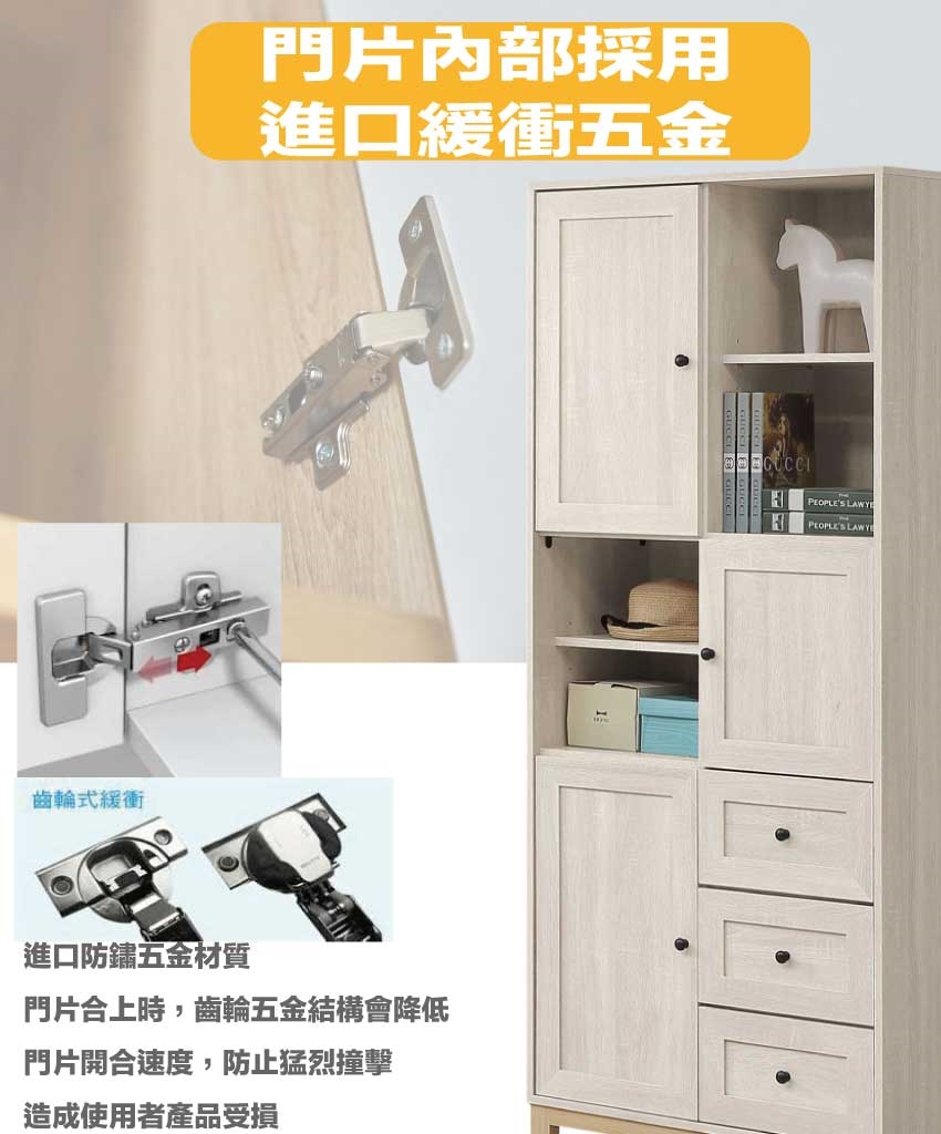 材質:防蛀木心板+防潮耐磨腳座+五金滑軌結構+防夾手緩衝門片五金