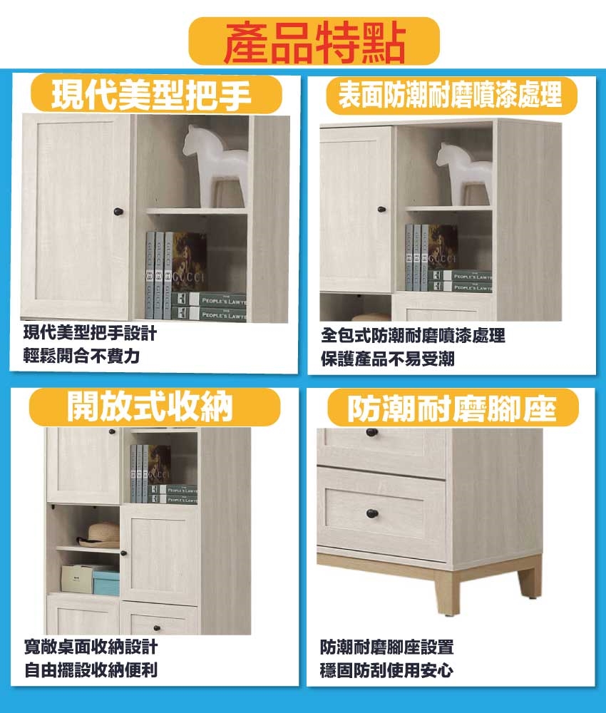 搭配採用開門櫃+三抽屜+內&外開放層格等收納空間設計