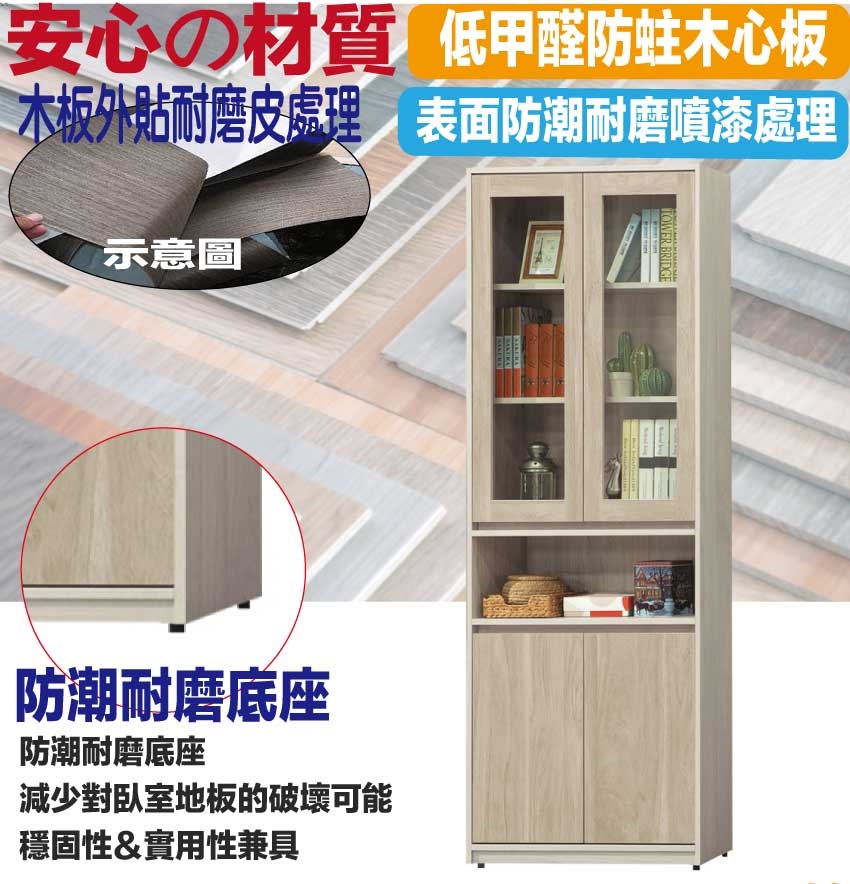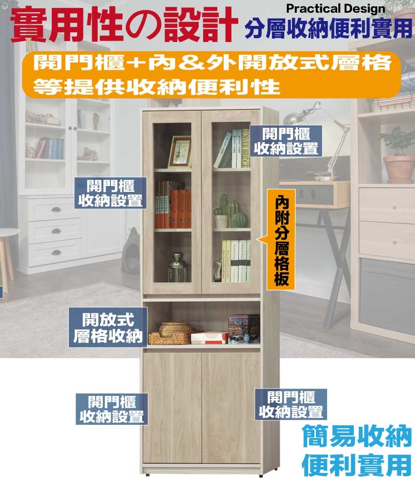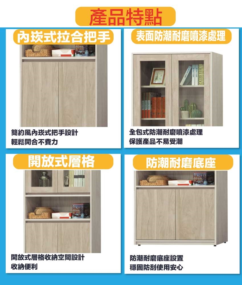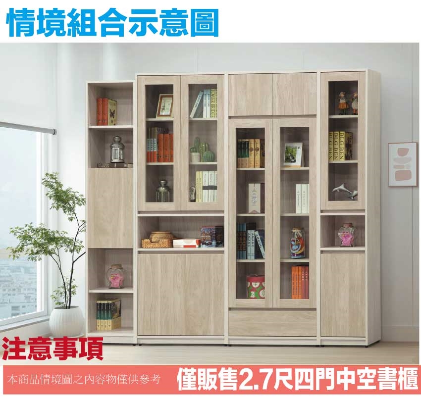 【綠家居】恩斯2.7尺四門中空收納櫃/書櫃      木紋雙色系+安心材質製造,使用放心+搭配居家更便利,採用防蛀木心板+防潮耐磨腳座等安心材質製造 ,外層採用防潮耐磨噴漆處理搭配採用開門櫃+內&外開放式層格等收納空間設計,全由專人配送到家,專業安心服務,替你省下更多時間!