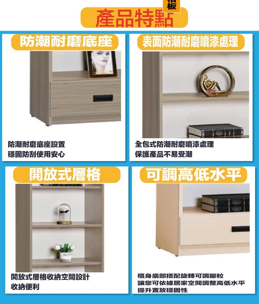 材質:防蛀木心板+防潮耐磨底座(可調高低水平)