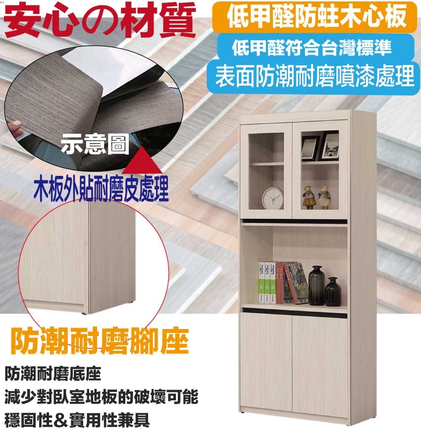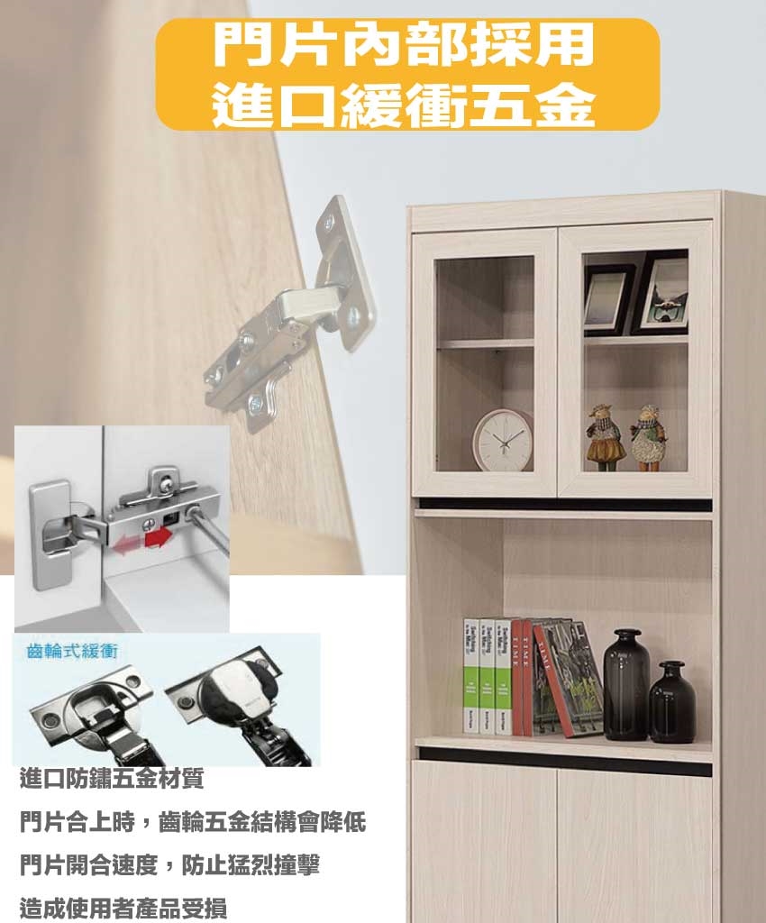材質:防蛀木心板+防潮耐磨底座(可調高低水平)+防夾手緩衝門片五金