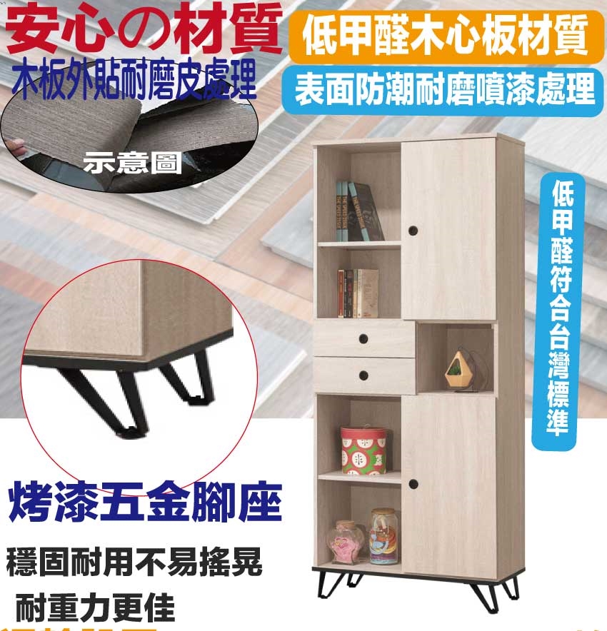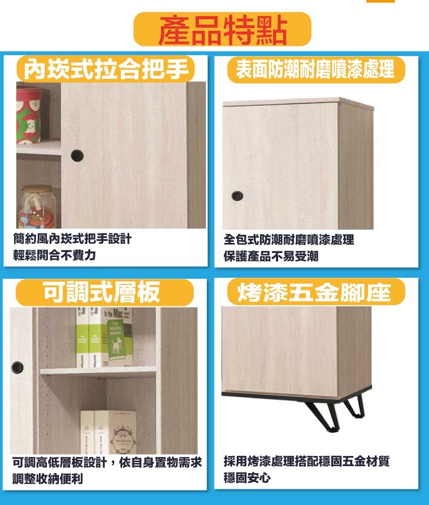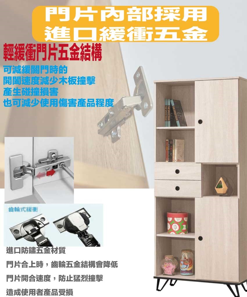 材質:防蛀木心板+烤漆金屬腳座+防夾手緩衝門片五金