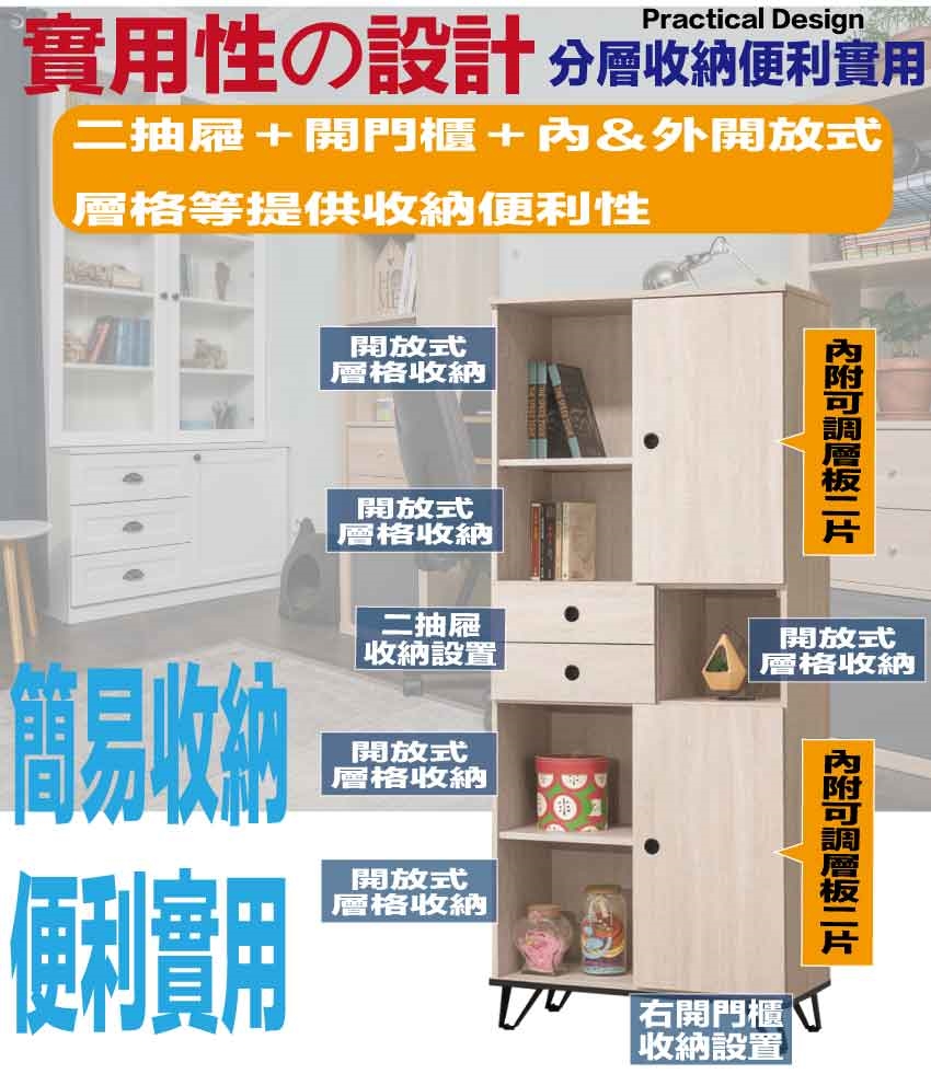採用開門櫃+二抽屜+內&外開放層格等收納空間設計