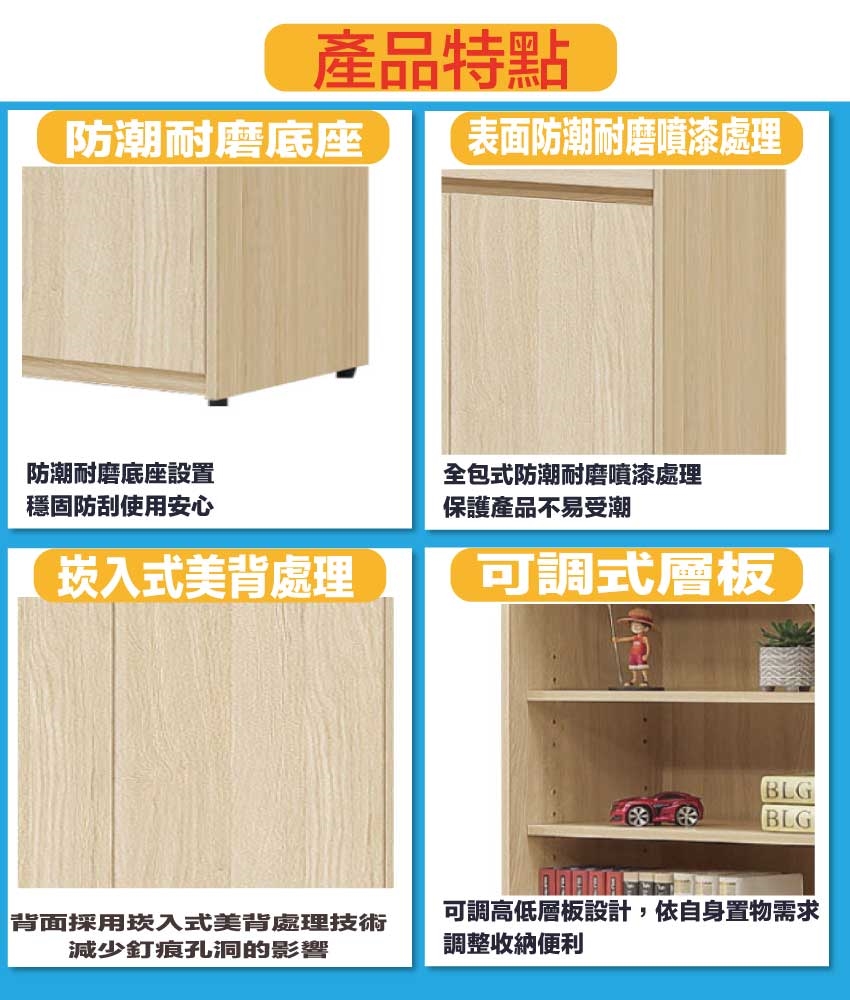 材質:防蛀木心板+防潮耐磨底座(可調高低水平)+防夾手緩衝門片五金
