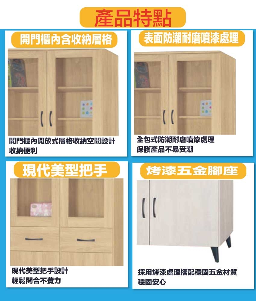 【綠家居】田野2.7尺四門二抽書櫃(四色可選) 四色可選+安心材質製造,使用放心+搭配居家更便利,採用防蛀木心板+烤漆五金腳座+五金滑軌結構+防夾手緩衝門片五金等安心材質製造 ,外層採用防潮耐磨噴漆處理搭配採用開門櫃+二抽屜+內開放層格等收納空間設計,全由專人配送到家,專業安心服務,替你省下更多時間!