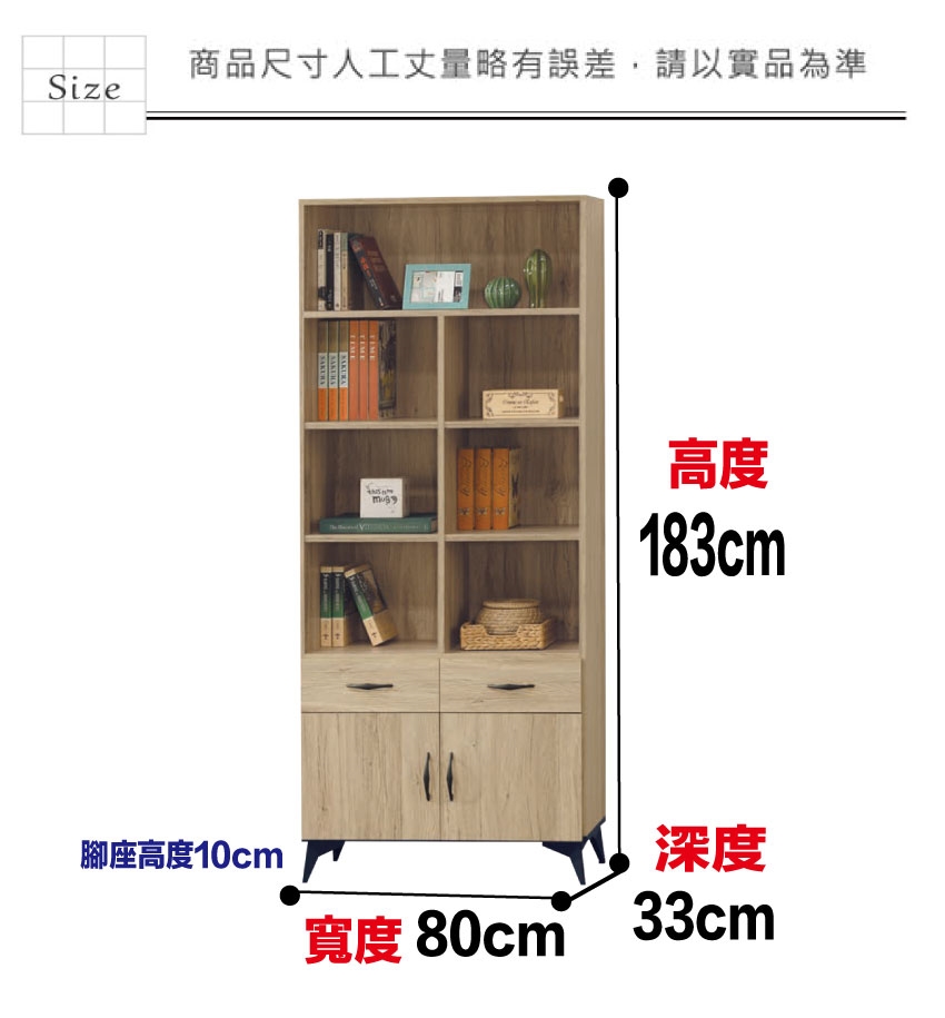 產品名稱:【綠家居】伊爾2.7尺二門二抽書櫃 - 尺寸:(寬)80x(深)33x(高)183/公分