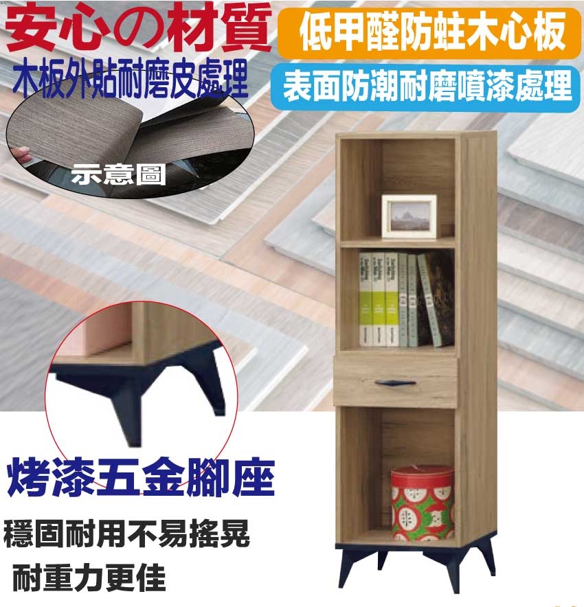 【綠家居】伊爾1.3尺單抽開放書櫃 橡木紋色系+安心材質製造,使用放心+搭配居家更便利,採用防蛀木心板+烤漆五金腳座等安心材質製造 ,外層採用防潮耐磨噴漆處理搭配採用單抽屜+開放層格等收納空間設計,全由專人配送到家,專業安心服務,替你省下更多時間!
