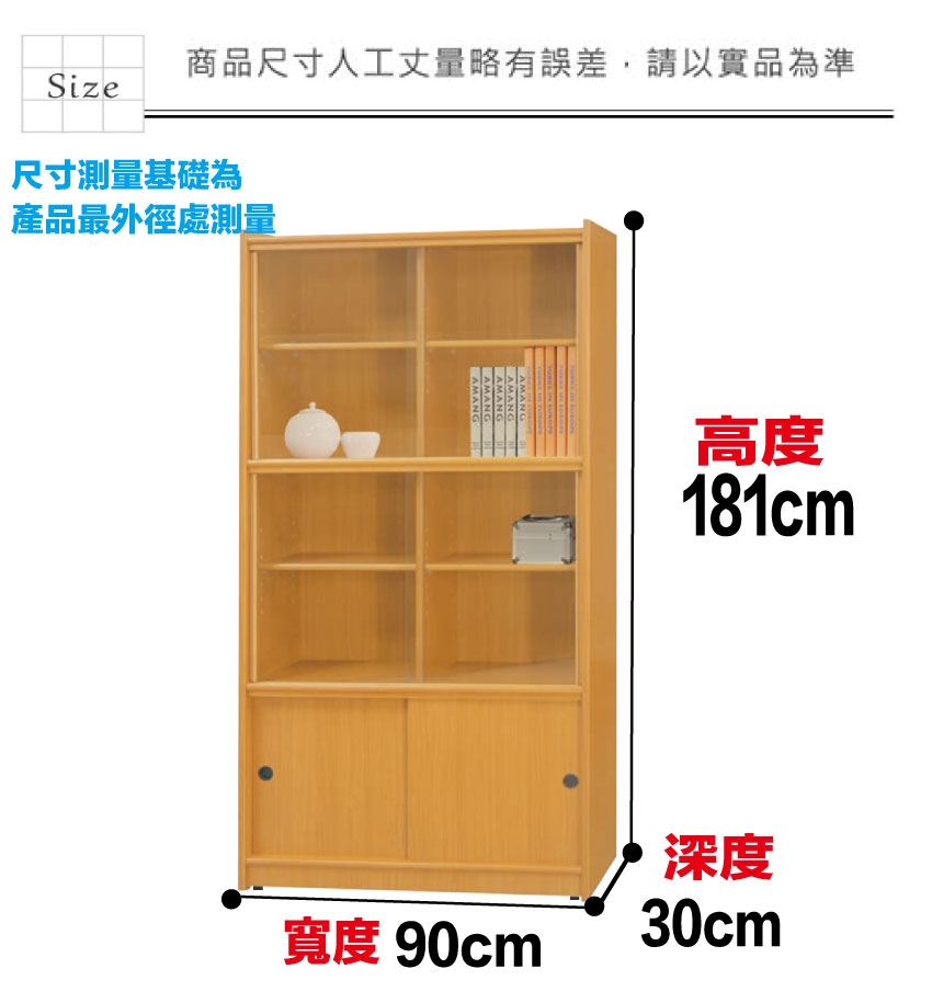 產品名稱:【綠家居】康永3尺玻璃雙推門書櫃(四色可選) - 尺寸:(寬)90x(深)30x(高)181/公分