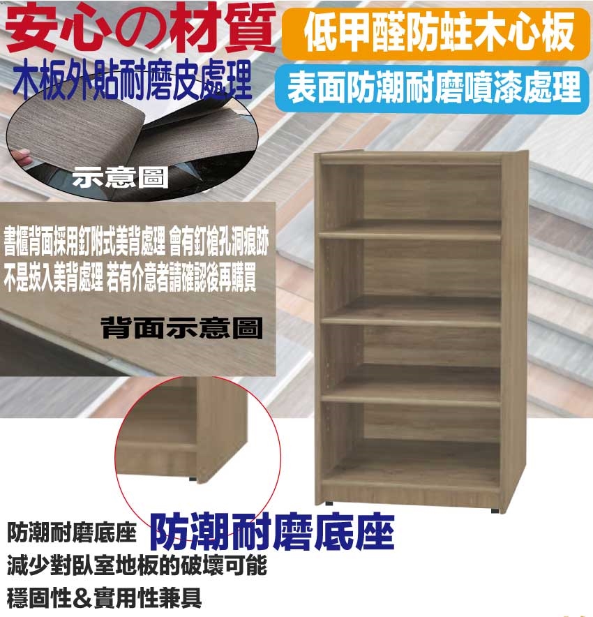 【綠家居】康永2尺開放四格書櫃(四色可選) 四色可選+安心材質製造,使用放心+搭配居家更便利,採用防蛀木心板+防潮耐磨底座等安心材質製造 ,外層採用防潮耐磨噴漆處理搭配採用開放多層格收納空間設計,全由專人配送到家,專業安心服務,替你省下更多時間!