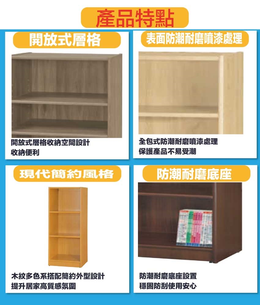 【綠家居】康永1.5尺開放三格書櫃(四色可選) 四色可選+安心材質製造,使用放心+搭配居家更便利,採用防蛀木心板+防潮耐磨底座等安心材質製造 ,外層採用防潮耐磨噴漆處理搭配採用開放多層格收納空間設計,全由專人配送到家,專業安心服務,替你省下更多時間!