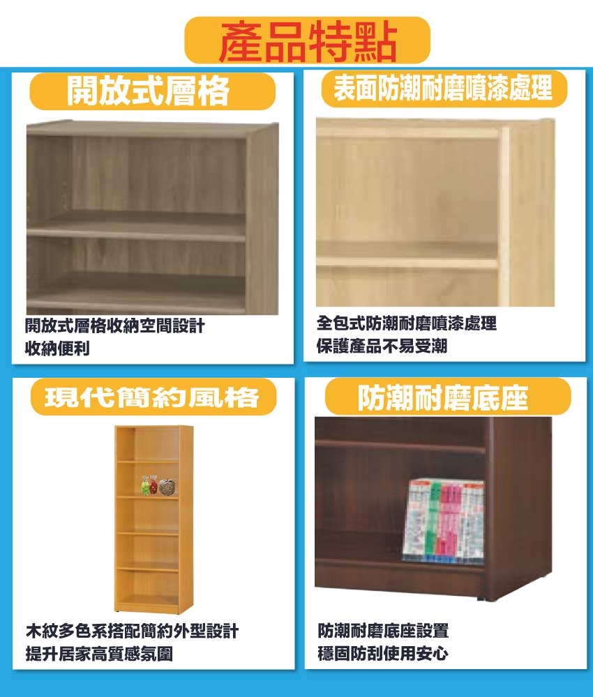 【綠家居】康永2尺開放五格書櫃(四色可選) 四色可選+安心材質製造,使用放心+搭配居家更便利,採用防蛀木心板+防潮耐磨底座等安心材質製造 ,外層採用防潮耐磨噴漆處理搭配採用開放多層格收納空間設計,全由專人配送到家,專業安心服務,替你省下更多時間!