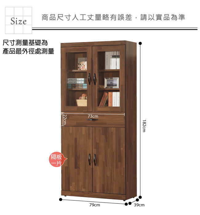 ◆產品名稱:【綠家居】藍歐 時尚2.6尺四門單抽書櫃/收納櫃 ◆產品尺寸: 書桌:(寬)79x (深)39 x(高)182/ 公分 ◆產品材質: 塗裝:優麗坦耐磨塗裝 材質:防蛀木心板 軌道:鋼珠滑軌 玻璃:高硬度強化玻璃 五金:防夾手緩衝門片五金 商品編號 | 尺寸 | 顏色 | 組裝方式 |