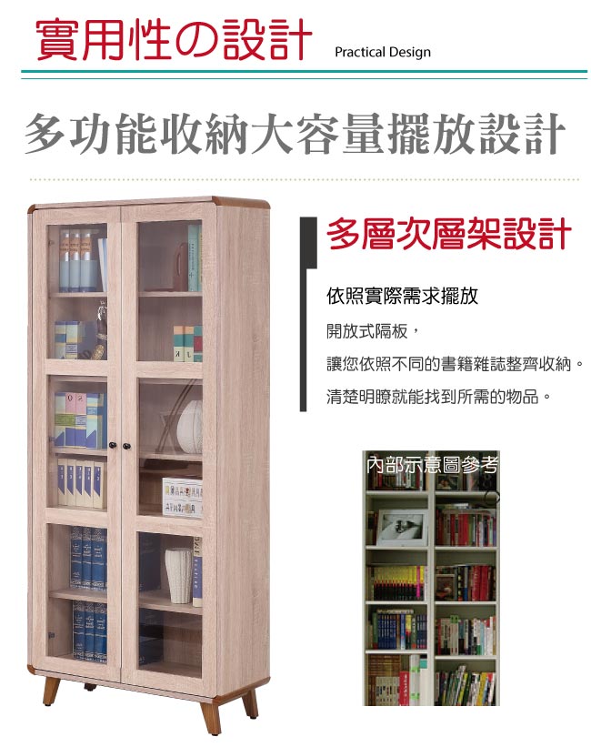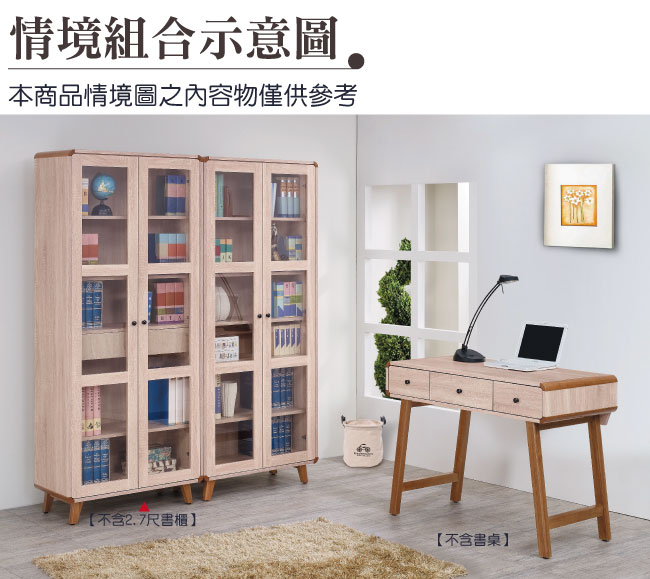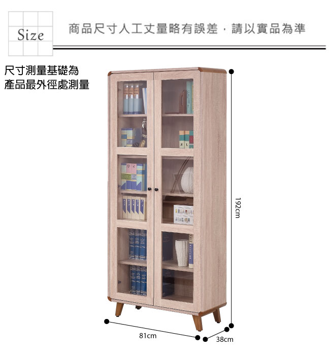 ◆產品名稱:【綠家居】麥味登 橡木紋2.7尺二門書櫃/收納櫃(開放式層格) ◆產品尺寸: 書桌:(寬)81x (深)38 x(高)192/ 公分 ◆產品材質: 塗裝:優麗坦耐磨塗裝 材質:防蛀木心板 腳座:松木實木腳座 玻璃:高硬度強化玻璃 五金:防夾手緩衝門片五金商品編號 | 尺寸 | 顏色 | 組裝方式 |