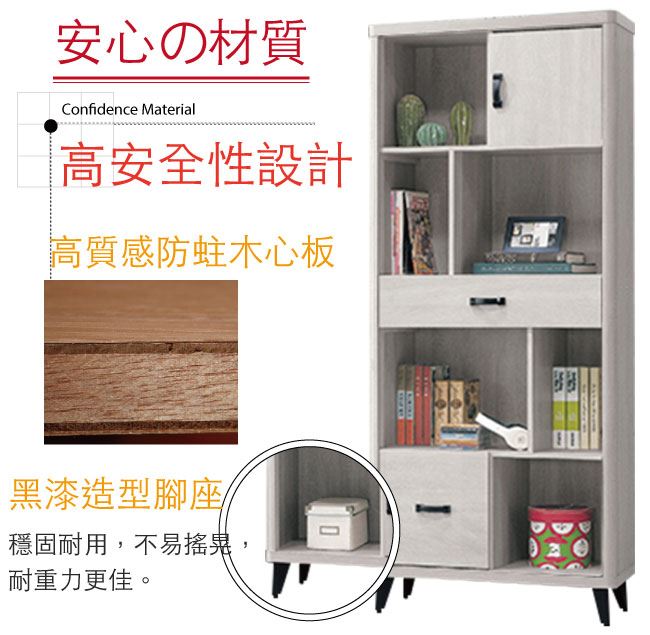 材質 | ◆產品名稱: 【綠家居】歐利 現代2.6尺二門單抽書櫃/收納櫃 產品尺寸: 尺寸:(寬)78(深)39.7x(高)193/公分 ◆材質: 材質:防蛀木心板+五金滑軌結構+防潮黑漆腳座+防夾手緩衝門片五金 塗漆:優利坦全包式耐磨噴漆處理