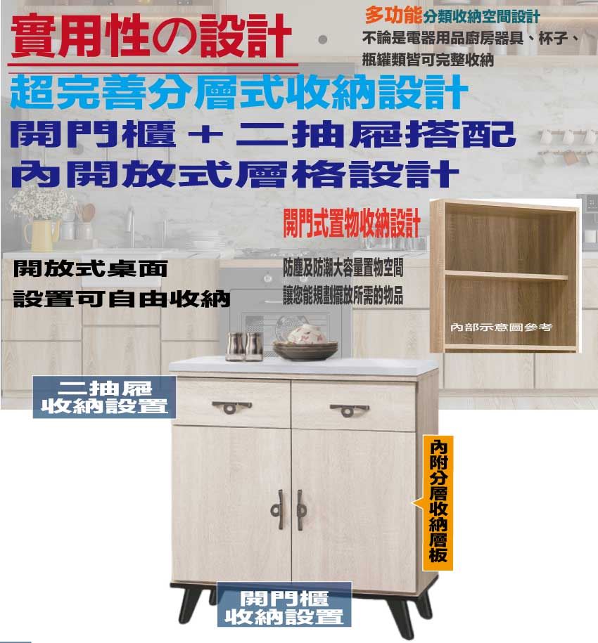 採用開門櫃+二抽屜+內開放層格等收納空間設計