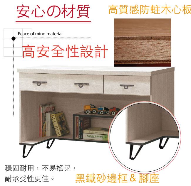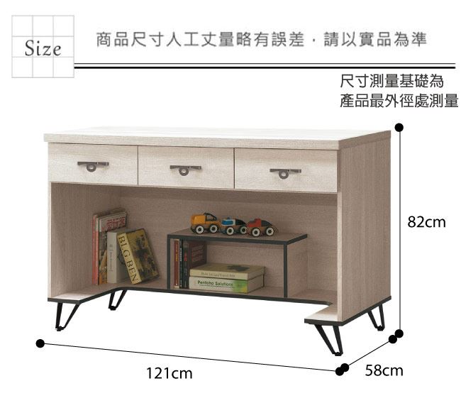 材質 | ◆產品名稱:【綠家居】 洛沃 時尚4尺三抽書桌 尺寸:(寬)121x(深)58x(高)82/公分 ◆材質: 材質:防蛀木心板+五金滑軌結構+防鏽黑漆腳座 |