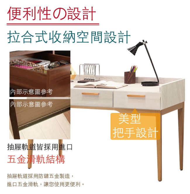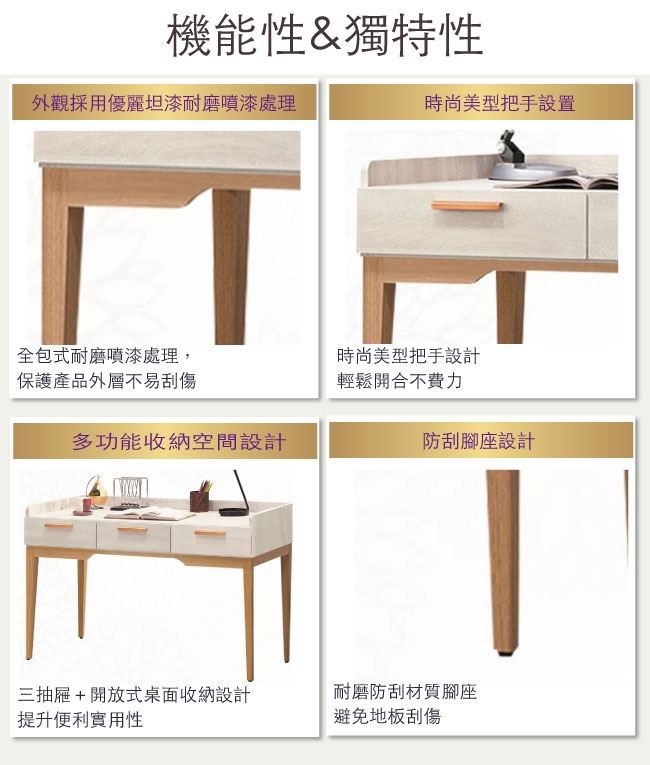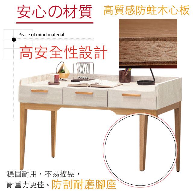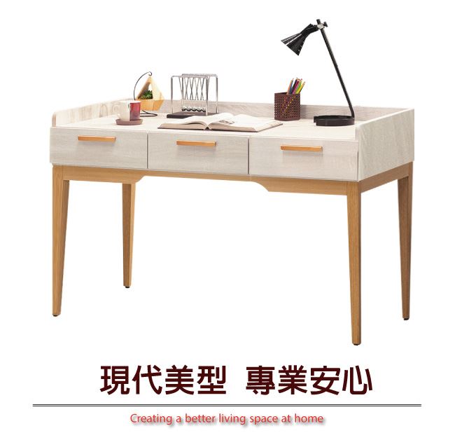 商品介紹 | 【綠家居】伊森瑪 現代4尺三抽書桌 木紋雙色系+現代簡約風格+安心材質製造,整體採用防蛀木心板+防潮耐磨腳座+五金滑軌結構等安心材質製造,外層採用優利坦全包式耐磨噴漆處理搭配三抽屜+開放式收納等收納設計,全由專人配送到家,專業安心服務,替你省下更多時間! 【商品特色】 木紋雙色系+現代簡約風格+安心材質製造,使用放心+搭配居家更便利 採用防蛀木心板+防潮耐磨腳座+五金滑軌結構等安心材質製造 三抽屜+開放式收納等收納設計 此商品不需要DIY組立,此商品為組立後之成品 品質保證、專業設計、貼心服務 全由專人配送到家,專業安心服務,替您省下更多時間 |