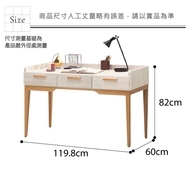 材質 | ◆產品名稱:【綠家居】 伊森瑪 現代4尺三抽書桌 產品尺寸: 收納櫃尺寸:(寬)119.8x(深)60x(高)82/公分 ◆材質: 材質:防蛀木心板+防潮耐磨腳座 材質:五金滑軌結構 塗漆:優利坦全包式耐磨噴漆處理 |