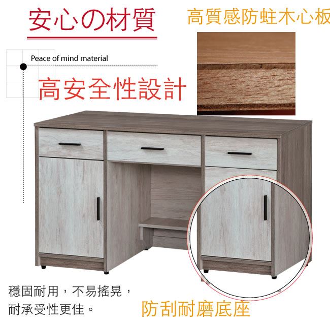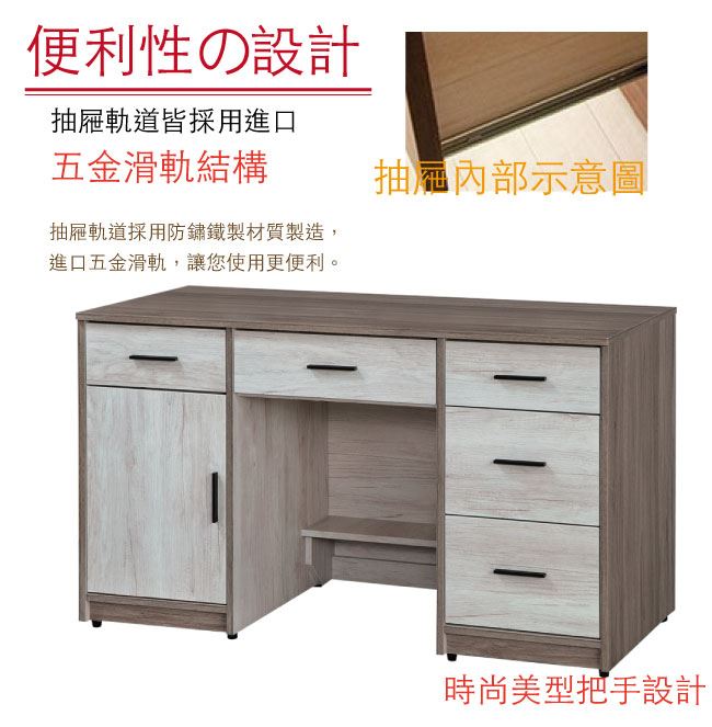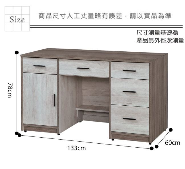 材質 | ◆產品名稱:【綠家居】蘇魯 時尚4.4尺五抽單門書桌 尺寸:(寬)133x(深)60x(高)78/公分 ◆材質: 材質:防蛀木心板+五金滑軌結構+防潮耐磨腳座 |