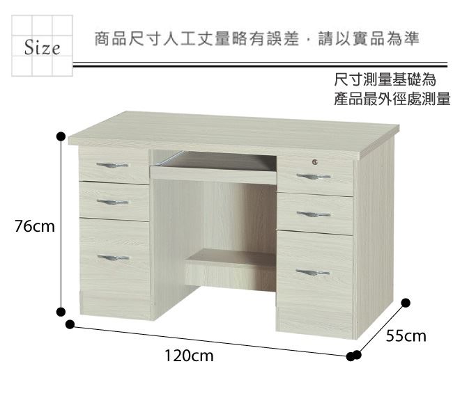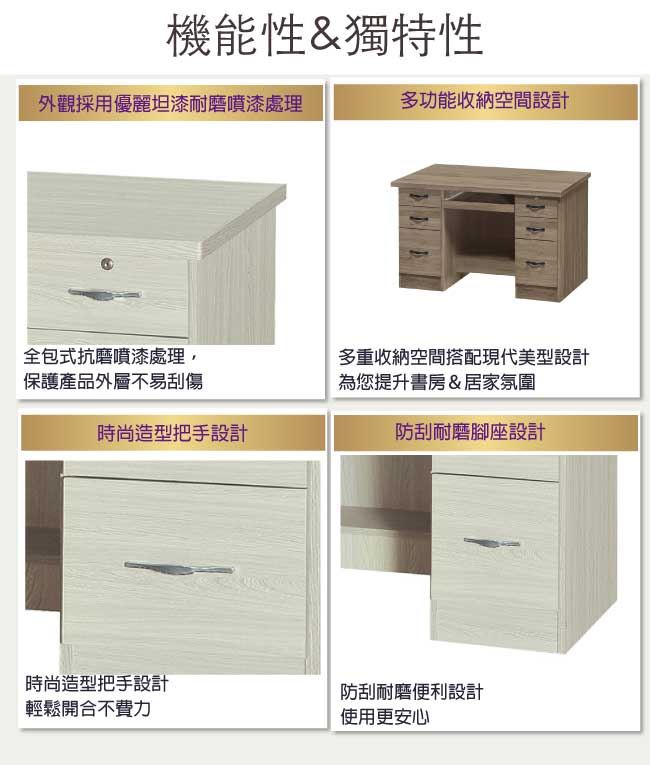 材質 | ◆產品名稱: 【綠家居】馬多爾 時尚4尺六抽拉合鍵盤書桌(二色可選) 尺寸:(寬)120x(深)55x(高)76/公分 ◆材質: 材質:防蛀木心板+防潮耐磨腳座+五金滑軌結構 噴漆:防潮耐磨噴漆處理