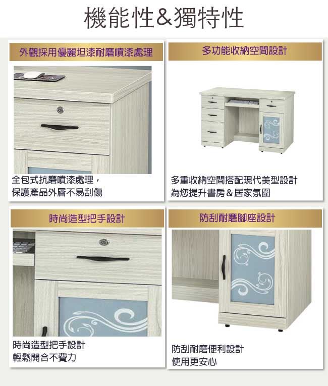 材質 | ◆產品名稱: 【綠家居】歐爾 時尚4.2尺四抽單門拉合鍵盤書桌 尺寸:(寬)127x(深)60x(高)82/公分 ◆材質: 材質:防蛀木心板+防潮耐磨腳座+五金滑軌結構 噴漆:防潮耐磨噴漆處理