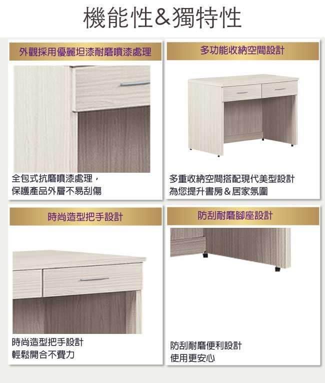 材質 | ◆產品名稱: 【綠家居】福瑞 梣木紋4尺二抽書桌 產品尺寸: 尺寸:(寬)120x(深)59x(高)78/公分 ◆材質: 材質:防蛀木心板+防潮耐磨腳座 材質:五金滑軌結構 塗漆:優利坦全包式耐磨噴漆處理
