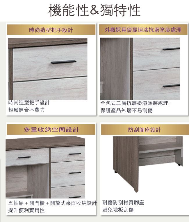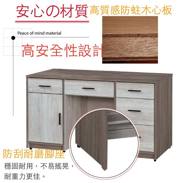 商品 介紹 | 【綠家居】歌利 現代4.4尺五抽單門書桌/電腦桌 木紋雙色系+現代簡約風格+安心材質製造,整體採用防蛀木心板+五金滑軌結構+防潮耐磨腳座等安心材質製造,外層採用優利坦全包式耐磨噴漆處理搭配採用開放式桌面收納+五抽屜+開門櫃等便利設計,全由專人配送到家,專業安心服務,替你省下更多時間! 【商品特色】 木紋雙色系+現代簡約風格+安心材質製造,使用放心+搭配居家更便利 採用防蛀木心板+五金滑軌結構+防潮耐磨腳座等安心材質製造 採用開放式桌面收納+五抽屜+開門櫃等便利設計 此商品不需要DIY組立,此商品為組立後之成品 品質保證、專業設計、貼心服務 全由專人配送到家,專業安心服務,替您省下更多時間 |