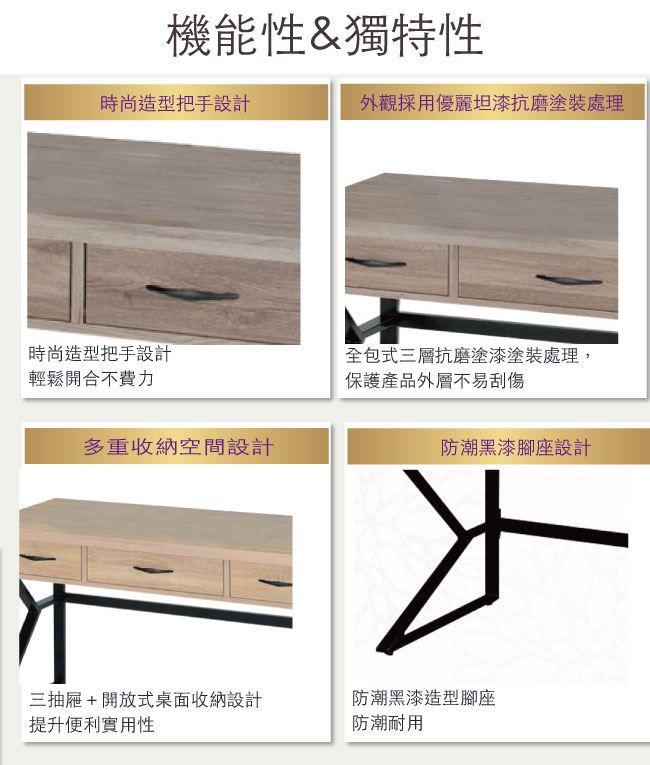 商品 介紹 | 【綠家居】派歐蒂 現代4尺三抽書桌/電腦桌組合(二色可選) 二色可選+現代簡約風格+安心材質製造,整體採用防蛀木心板+五金滑軌結構+黑鐵砂框架&腳座等安心材質製造,外層採用優利坦全包式耐磨噴漆處理搭配採用開放式收納層格+三抽屜等便利設計,全由專人配送到家,專業安心服務,替你省下更多時間! 【商品特色】 二色可選+現代簡約風格+安心材質製造,使用放心+搭配居家更便利 採用防蛀木心板+五金滑軌結構+黑鐵砂框架&腳座等安心材質製造 採用開放式收納層格+三抽屜等便利設計 此商品不需要DIY組立,此商品為組立後之成品 品質保證、專業設計、貼心服務 全由專人配送到家,專業安心服務,替您省下更多時間 |