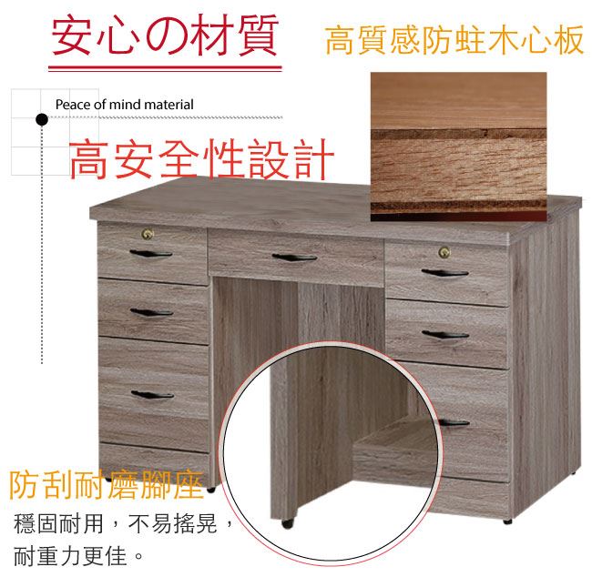商品 介紹 | 【綠家居】帕蒂 現代4尺七抽書桌/電腦桌(二色可選) 二色可選+現代簡約風格+安心材質製造,整體採用防蛀木心板+五金滑軌結構+防潮耐磨腳座等安心材質製造,外層採用優利坦全包式耐磨噴漆處理搭配採用開放式收納桌面+七抽屜等便利設計,全由專人配送到家,專業安心服務,替你省下更多時間! 【商品特色】 二色可選+現代簡約風格+安心材質製造,使用放心+搭配居家更便利 採用防蛀木心板+五金滑軌結構+防潮耐磨腳座等安心材質製造 採用開放式收納桌面+七抽屜等便利設計 此商品不需要DIY組立,此商品為組立後之成品 品質保證、專業設計、貼心服務 全由專人配送到家,專業安心服務,替您省下更多時間 |