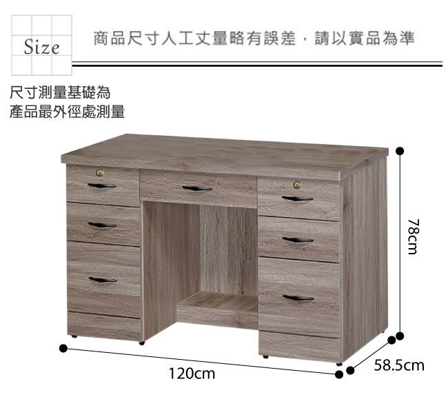 材質 | ◆產品名稱: 【綠家居】帕蒂 現代4尺七抽書桌/電腦桌(二色可選) 產品尺寸: 尺寸:(寬)120(深)58.5x(高)78/公分 ◆材質: 材質:防蛀木心板+五金滑軌結構+防潮耐磨腳座 塗漆:優利坦全包式耐磨噴漆處理