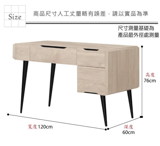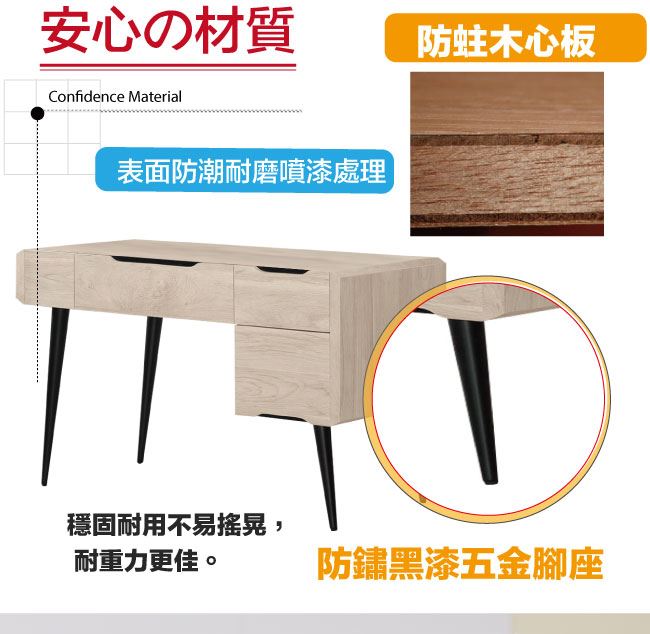 材質 | ◆產品名稱:【綠家居】麥格妮4尺三抽書桌 尺寸:(寬)120x(深)60(高)76公分 ◆材質: 材質:防蛀木心板+防鏽黑漆五金腳座+五金滑軌結構 噴漆:防潮耐磨噴漆處理