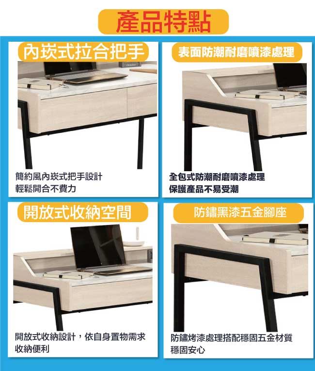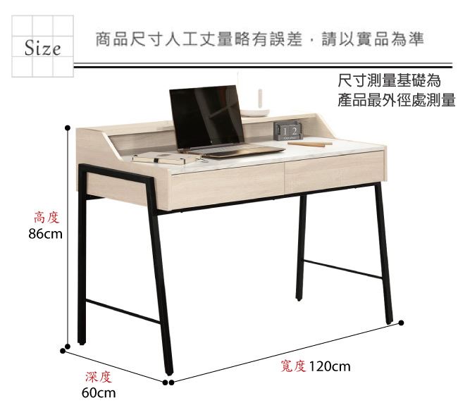 材質 | ◆產品名稱:【綠家居】伯尼爾4尺雙色二抽書桌 尺寸:(寬)120x(深)60(高)86公分 ◆材質: 材質:防蛀木心板+防鏽五金腳座+五金滑軌結構+仿雲紋石面紋路木質桌面板 噴漆:防潮耐磨噴漆處理