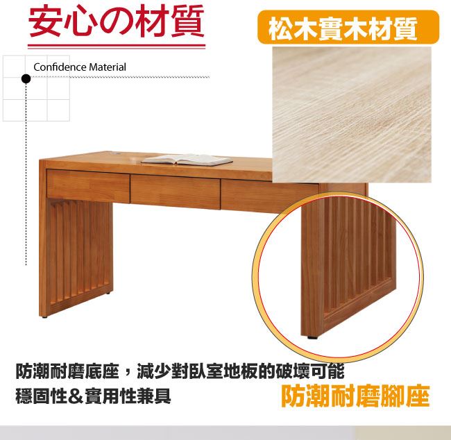 材質 | ◆產品名稱:【綠家居】卡德實木4.2尺三抽書桌/辦公桌 尺寸:(寬)127x(深)66.5(高)81/公分 ◆材質: 材質:松木實木+防潮耐磨腳座+五金滑軌結構 噴漆:防潮耐磨噴漆處理