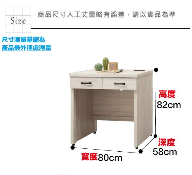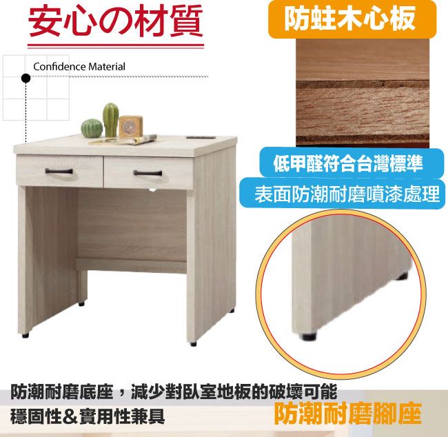 材質 | ◆產品名稱:【綠家居】美佳2.7尺二抽書桌(含便利插座設置) 書桌尺寸:(寬)80x(深)58(高)82/公分 ◆材質: 材質:防蛀木心板+五金滑軌結構+防潮耐磨底座 噴漆:防潮耐磨噴漆處理