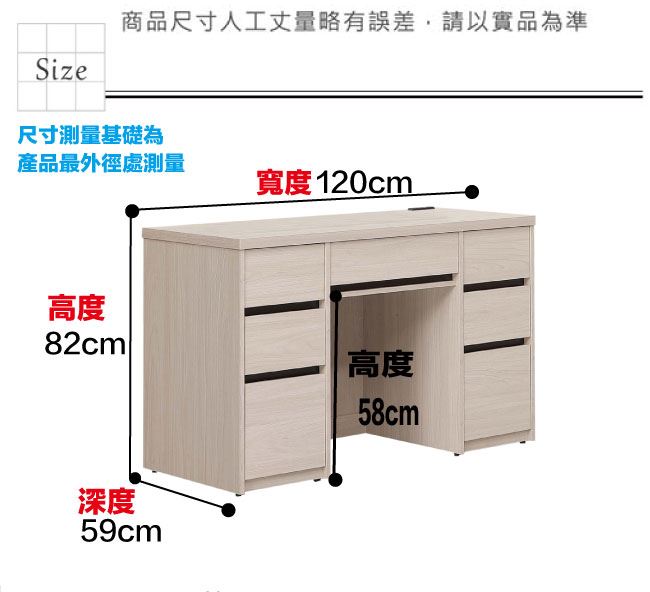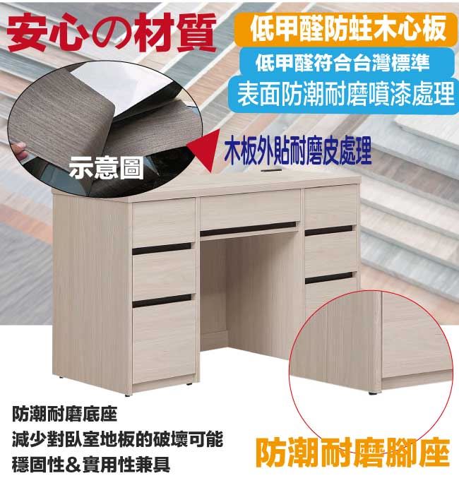 材質 | ◆產品名稱:【綠家居】麥森4尺七抽書桌 尺寸:(寬)120x(深)59(高)82/公分 ◆材質: 材質:防蛀木心板+防潮耐磨腳座+五金滑軌結構 噴漆:防潮耐磨噴漆處理