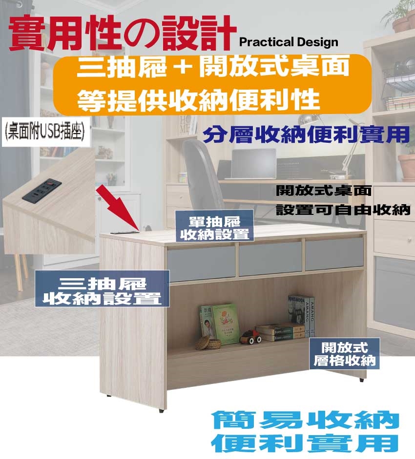 搭配採用三抽屜+桌面插座設置+開放桌面等收納空間設計