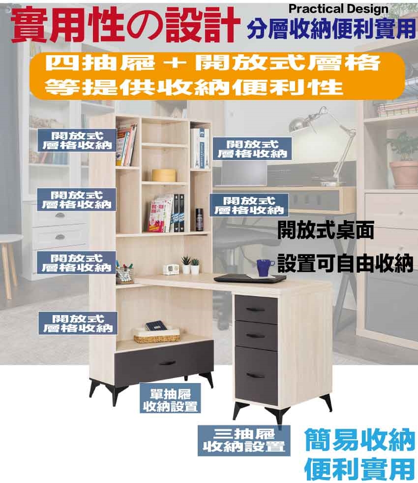 搭配採用四抽屜+開放桌面+開放層格等收納空間設計