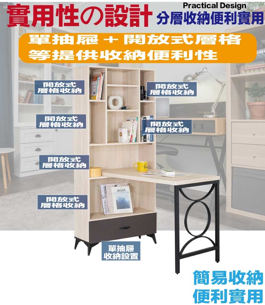 搭配採用單抽屜+開放桌面+開放層格等收納空間設計