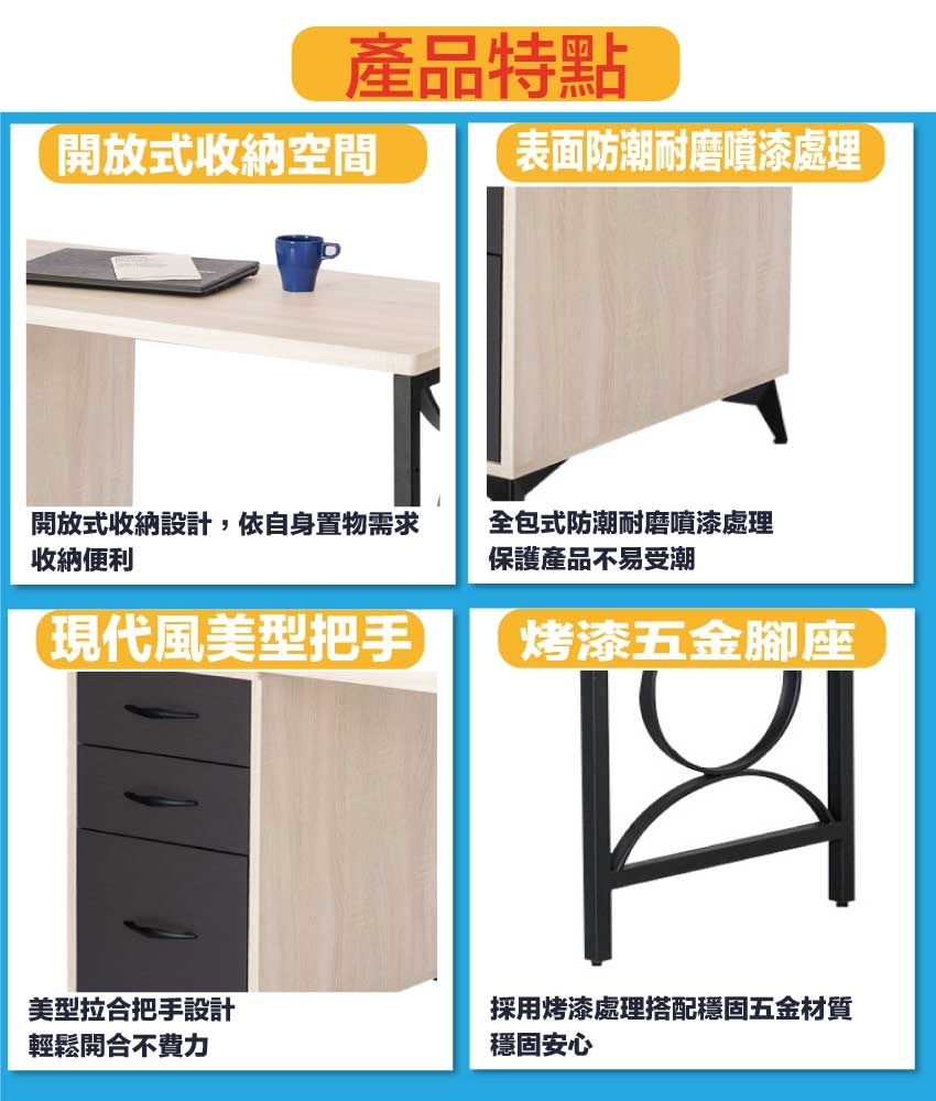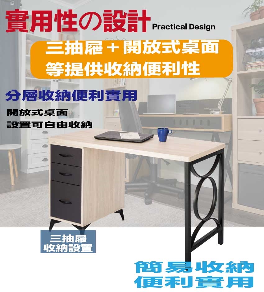 三抽屜+開放桌面等收納設計