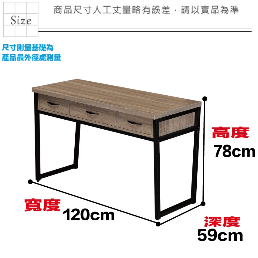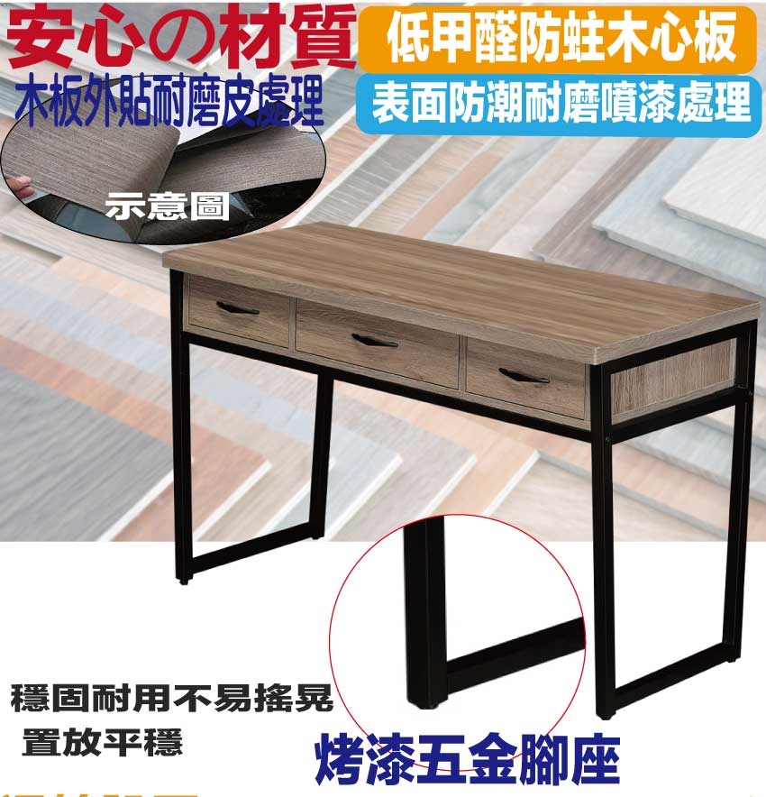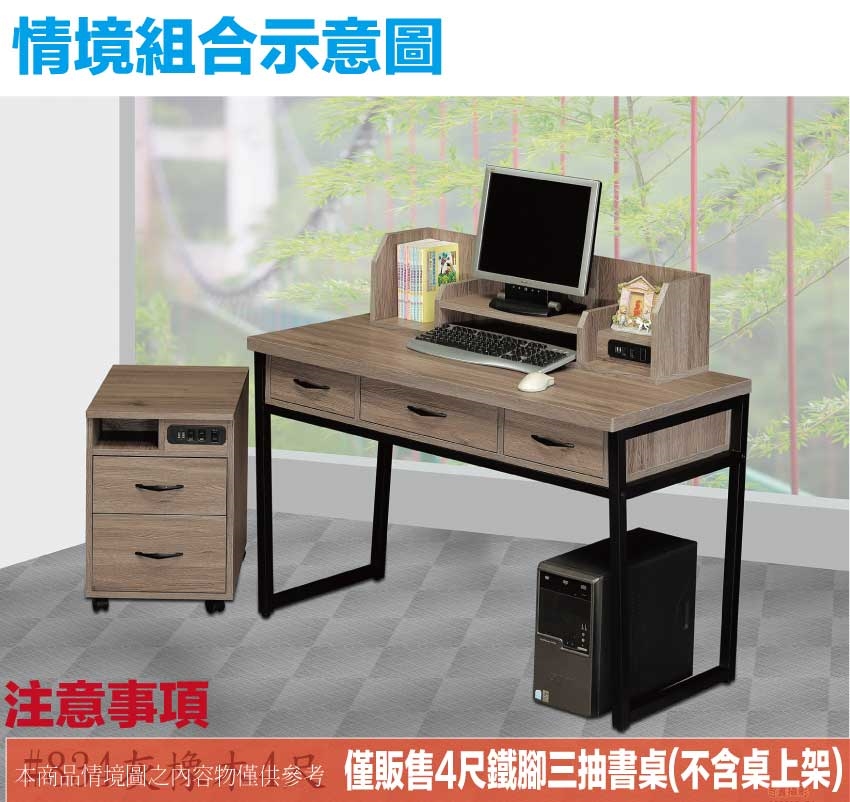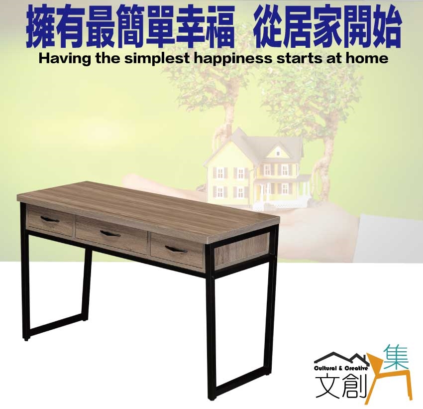 - ◆產品名稱:【綠家居】米雅灰橡4尺三抽鐵腳書桌