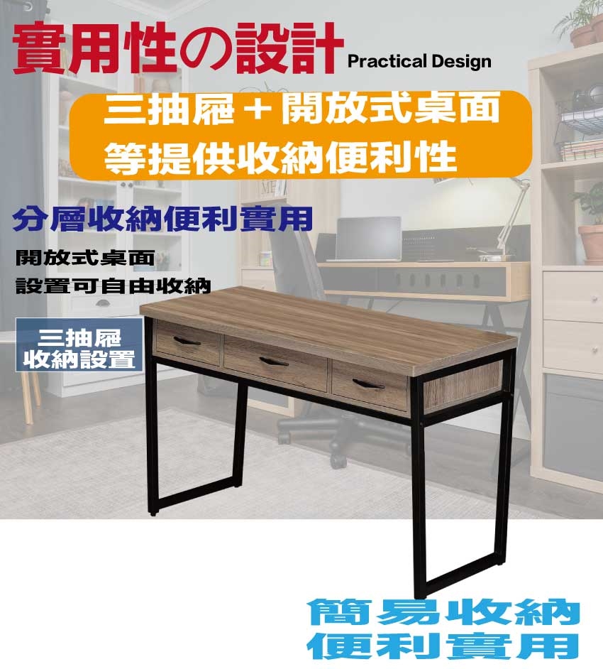 三抽屜+開放桌面等收納設計