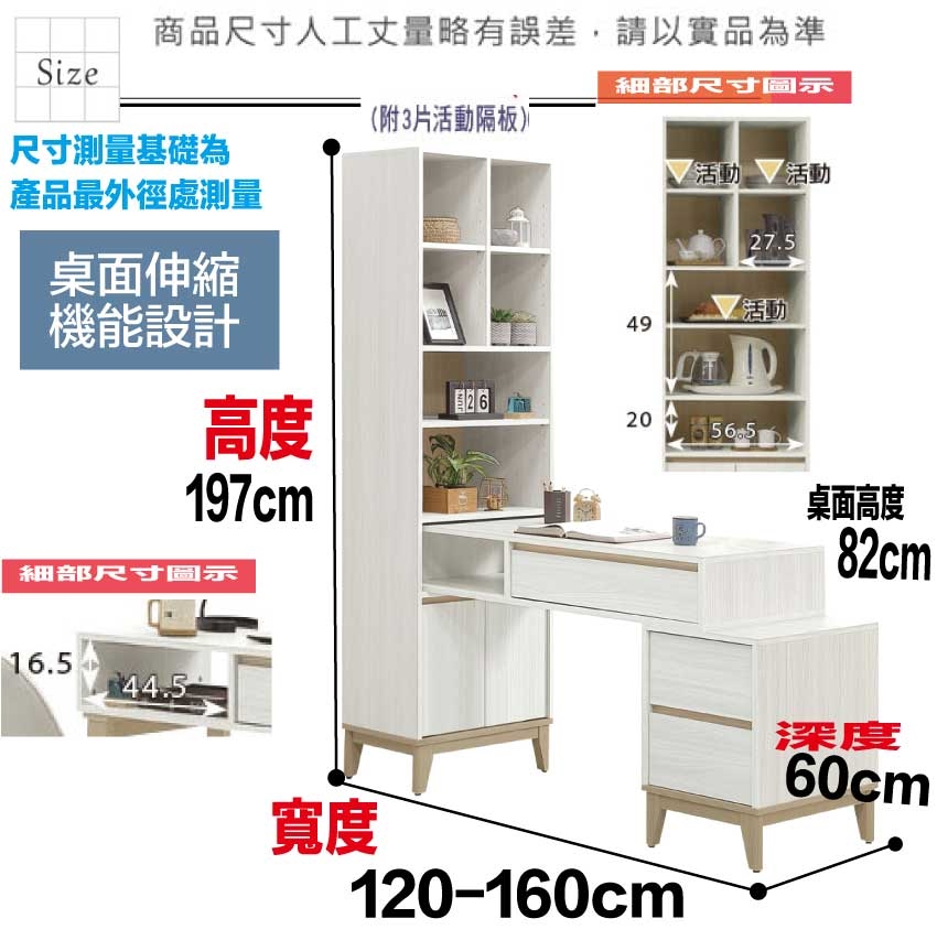 書桌面板可依實際使用需求調整寬度120-160cm,增加居家使用便利性