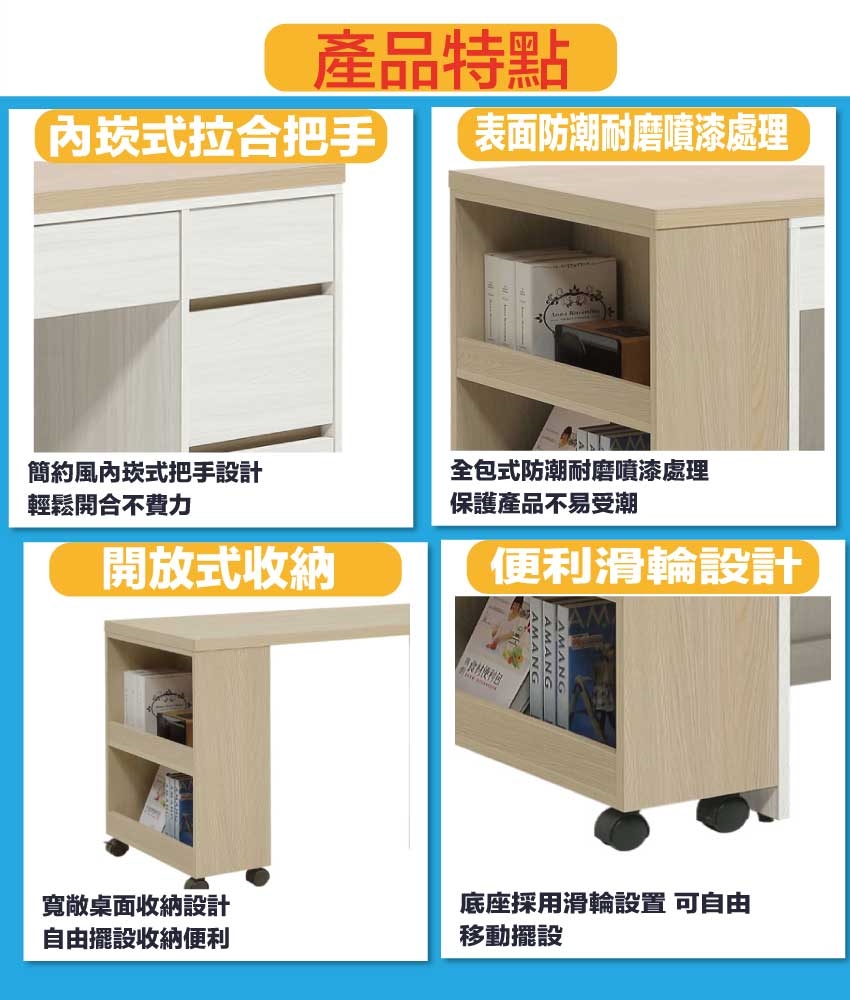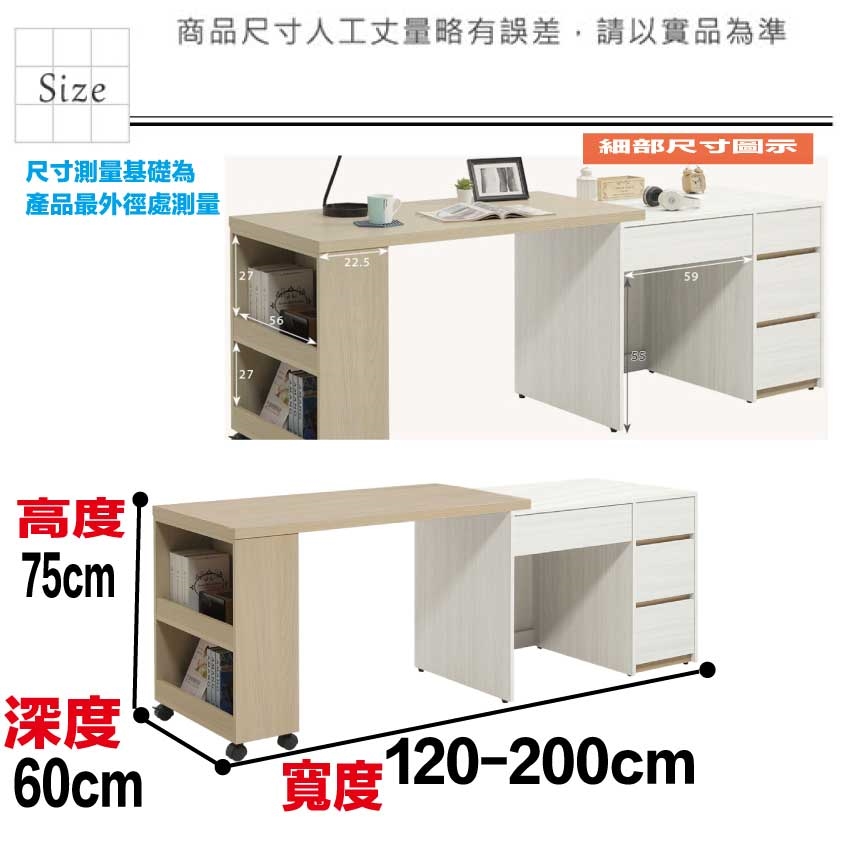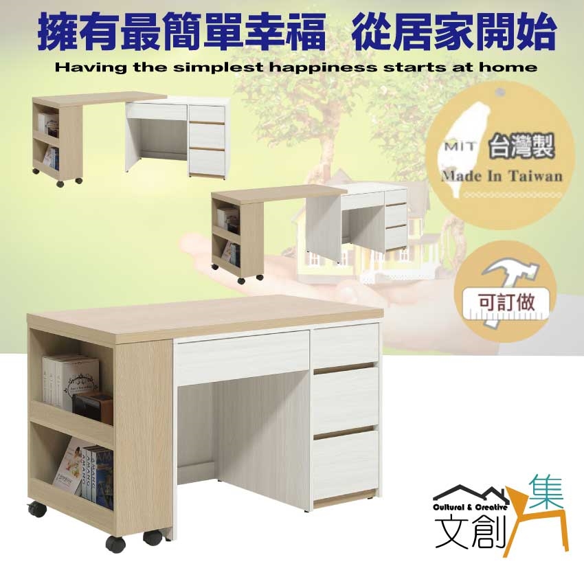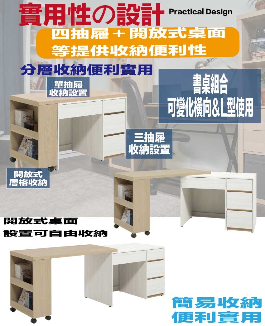 書桌面板可依實際使用需求調整寬度120-200cm搭配櫃身可變化擺設增加居家使用便利性